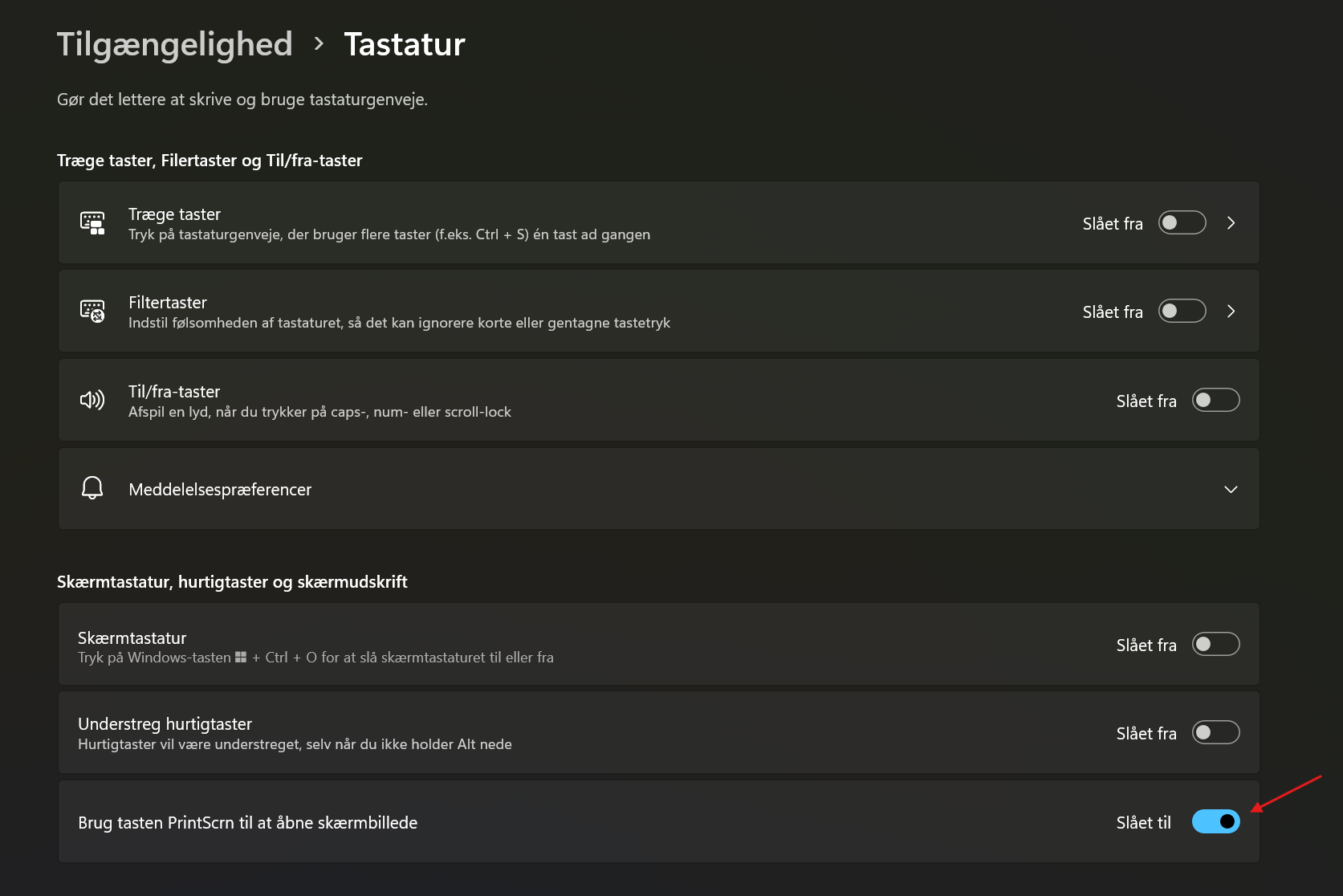 Åben Windows Indstillinger --> Tilgængelighed --> Tastatur --> Brug tasten PrintScrn til at åbne skærmbillede